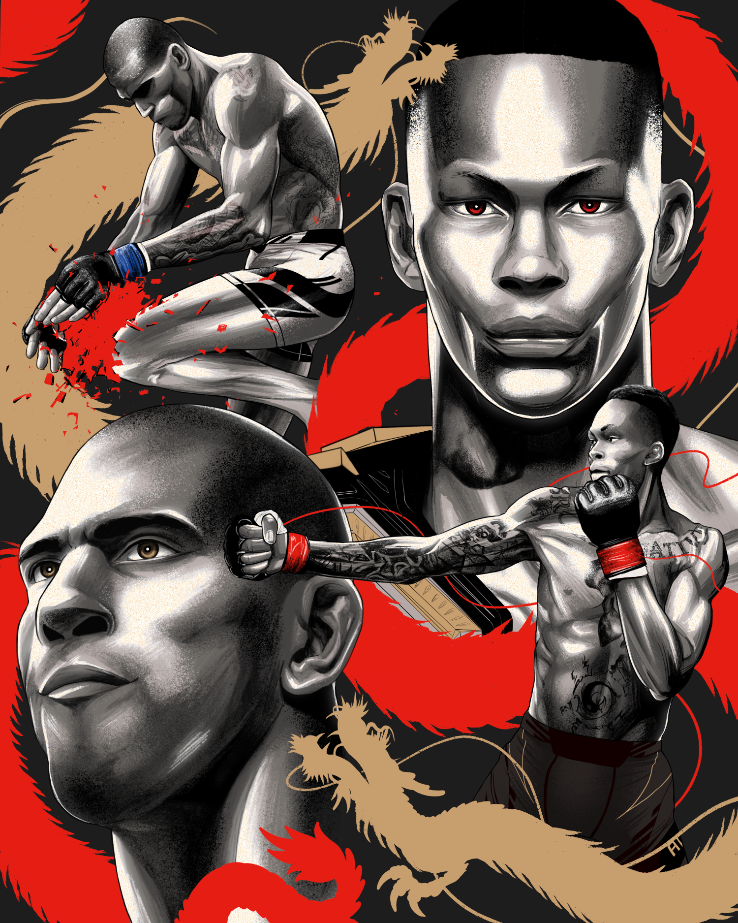 Both the fighters have dragon tattoos, so I drew these as a motif.